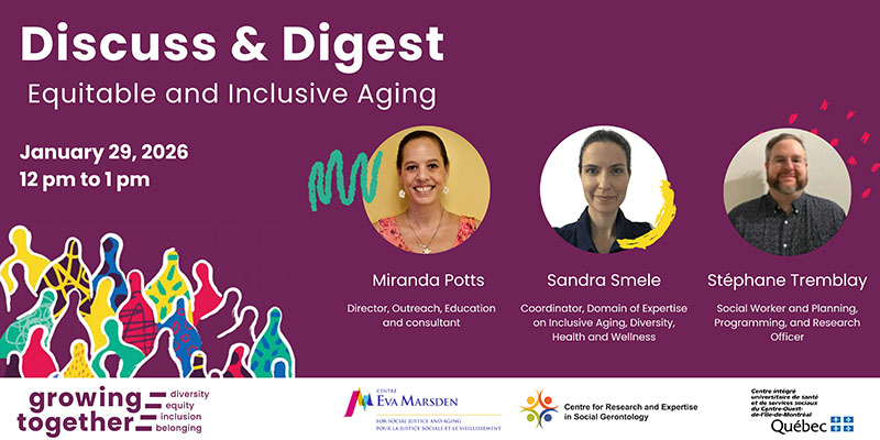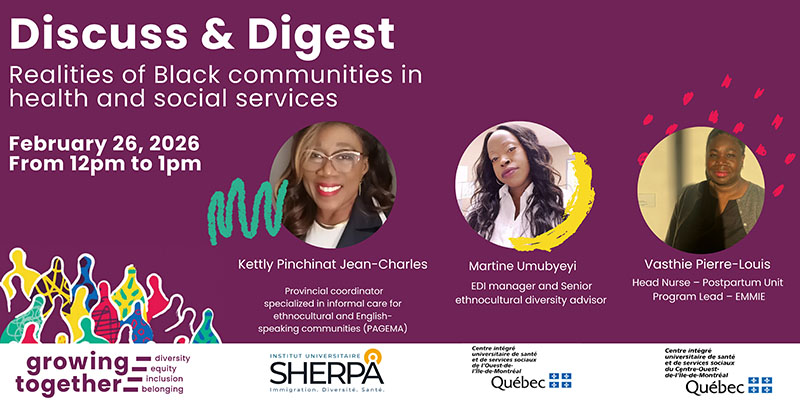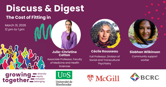 The DEIB team invites you to this month's Discuss & Digest with panelists Zarema Bulgak, social worker at the CCOMTL Jewish General Hospital; Syndie David, assistant professor at McGill University's School of Social Work and Emmanuelle Khoury, researcher and associate professor at the University of Montreal's School of Social Work.