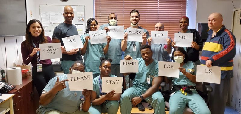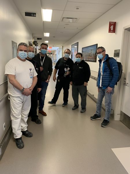 The first picture was taken at the very beginning of the pandemic, on March 25, 2020 (masks were not mandatory yet, which is why not everyone is wearing one). It is a picture of the Transport team at the Jewish General Hospital in their lounge area in the Pav C, 3rd floor. The Transport team became quickly involved in the transfer of COVID patients throughout the entire first wave. This picture helped provide a sense of solidarity within our team quite early as the pandemic began and changes started to take place.
