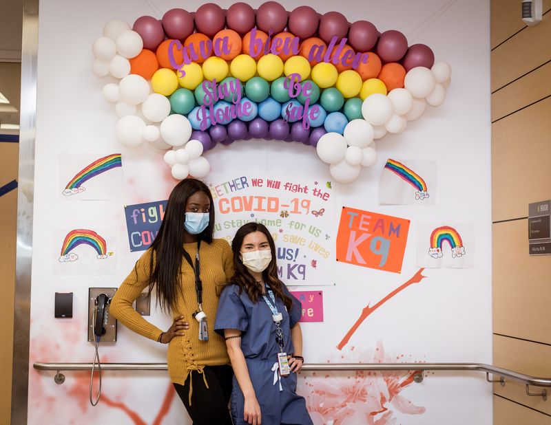 The second picture was taken on K9 at the JGH on Wednesday, April 22, 2020. The NRC was fortunate enough to receive a huge amount of donations for our hardworking staff. We had some extra goodies, and we thought it would be a good opportunity to thank some of the other healthcare workers who are continuously rising to the challenge. On that day, I asked 2 of my colleagues Serena Baffour (in this image), and Sheebenson Lareche to help distribute these gifs on the units. This was all done as a small gesture to help brighten people’s day.