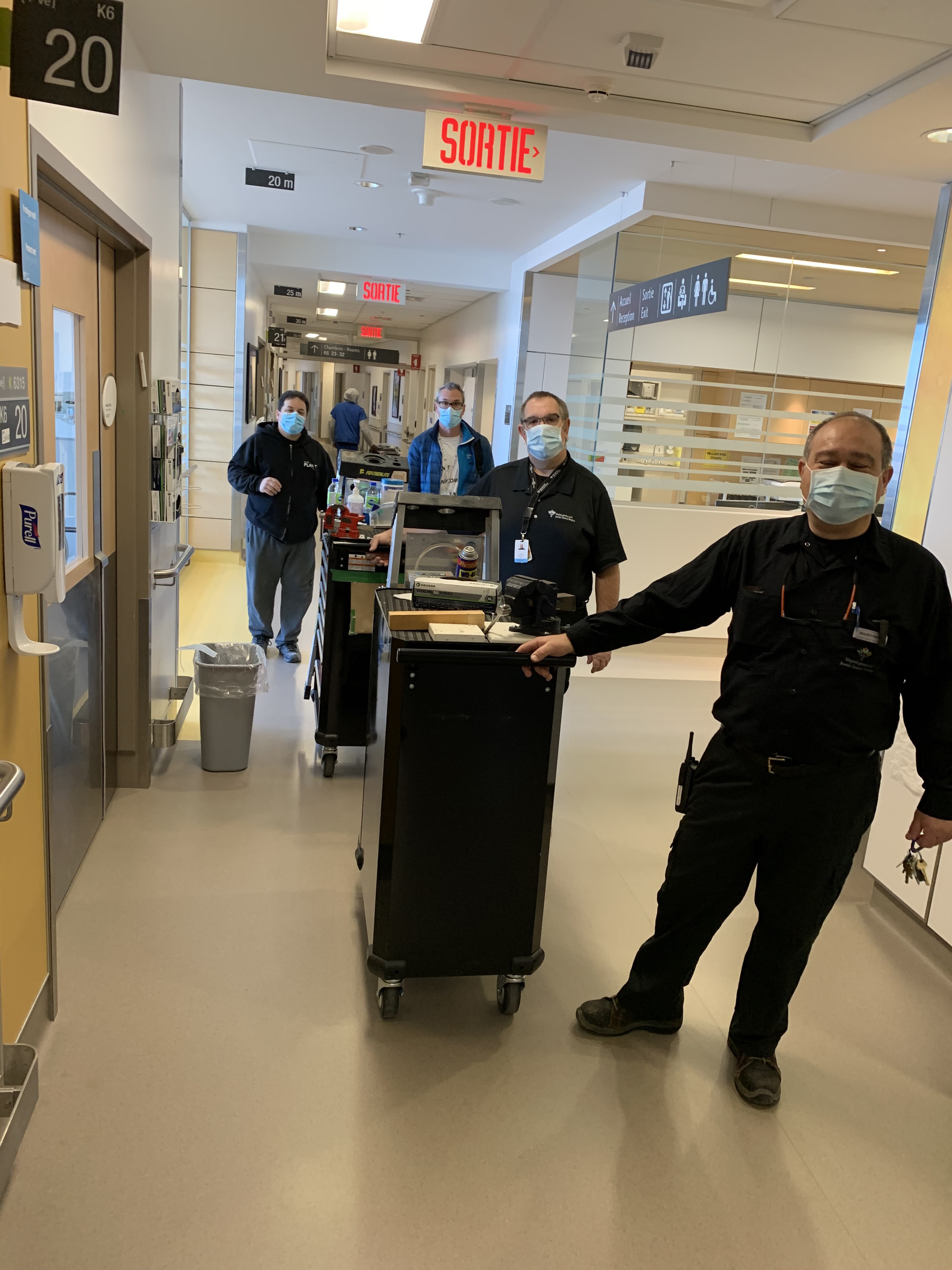 These are a few pictures of our team during the COVID-19 prep work to ensure that the dedicated areas were ready and safe to receive Covid-19 patients. We were responsible to build divisions, install plexi glass dividers and secure the affected units which consisting of everything from repairs to new installations.