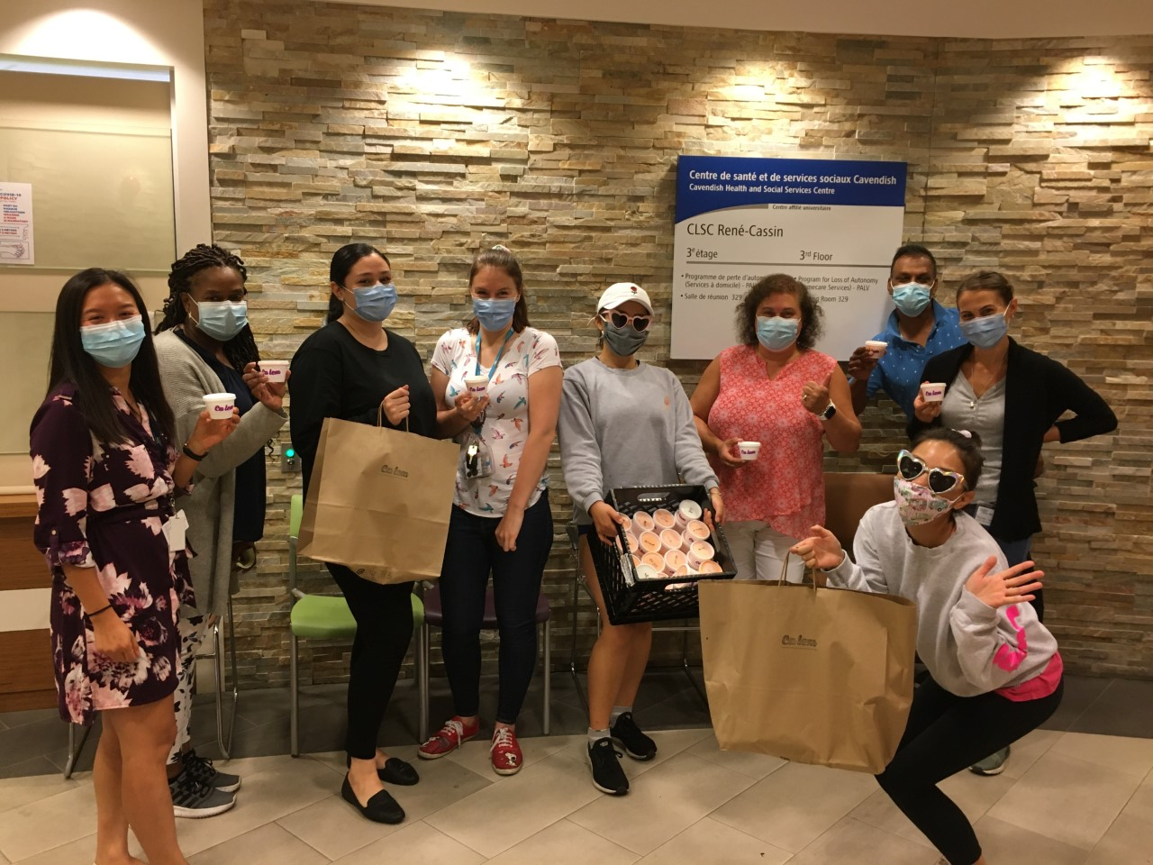 Voici une photo d'une partie de l'équipe du soutien à domicile du CLSC René-Cassin. Nous avons reçu dernière minute une donation de crème glacée par une crémerie sur le territoire, lors d'une des dernières journées chaudes d'été. C'était un petit moment de bonheur délicieux bien mérité, comme le démontre les sourires cachés dernière nos masques.